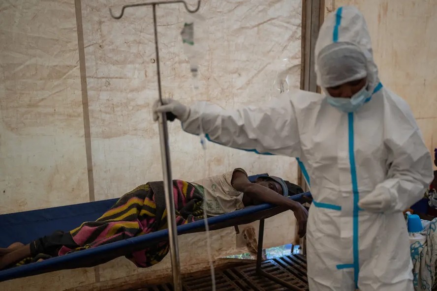 Um paciente em uma tenda de isolamento sendo tratado de cólera no ano passado no Malawi. A disseminação da doença lá foi causada por eventos climáticos catastróficos — Foto: João Silva/The New York Times