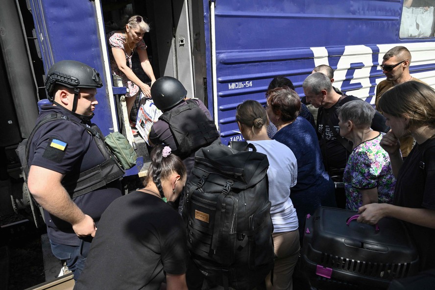 Pessoas embarcam em trem para deixar a região de Donetsk,diante do avanço de forças russas — Foto: Genya SAVILOV / AFP