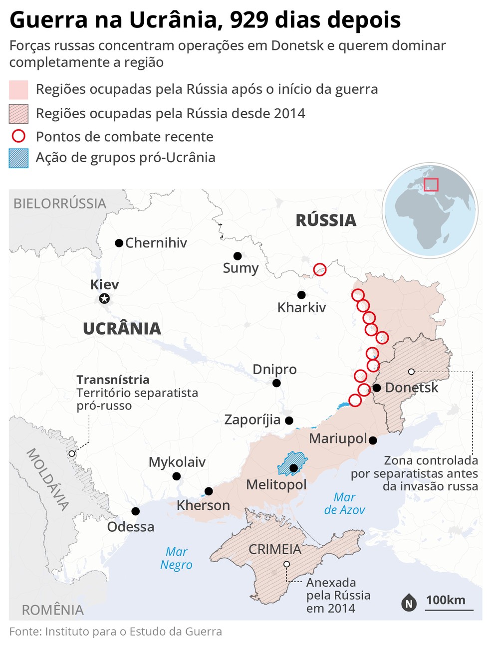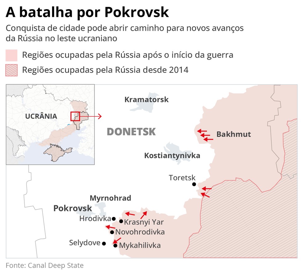 No último domingo,o comando militar da Rússia anunciou a conquista de Novohrodivka,no Leste da Ucrânia e que,antes do início da guerra,tinha pouco mais de 14 mil habitantes. Apesar de servir como mais um feito a ser vendido pelos propagandistas do Kremlin,a tomada confirmou que os russos caminham a passos largos rumo ao seu grande alvo neste fim de ano: Pokrovsk,cidade estratégica para a guerra,e cuja queda pode abrir caminho para a tomada da região de Donetsk.