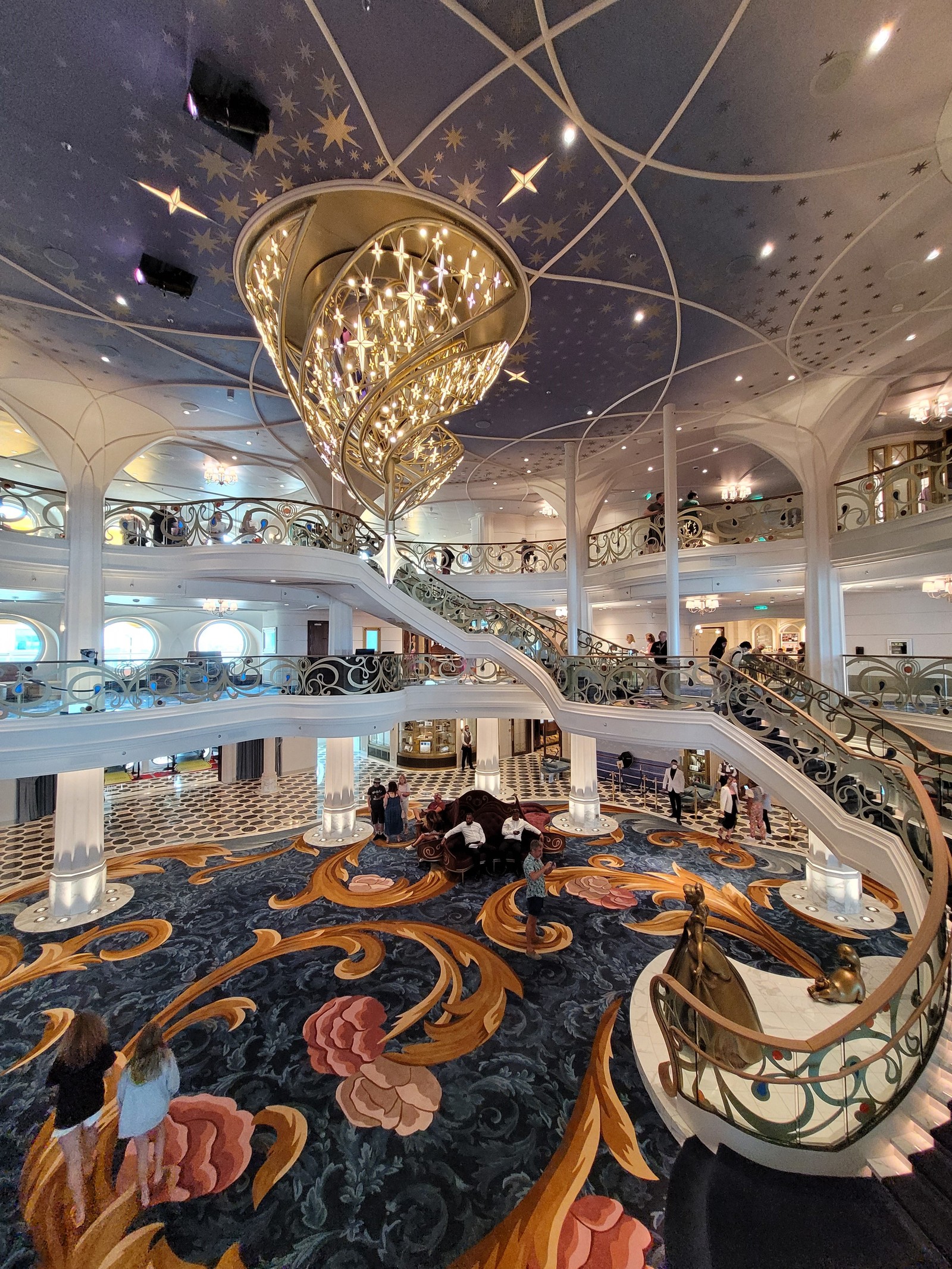O Grand Hall é o atrium principal do Disney Wish e recria o salão de um castelo de conto de fadas