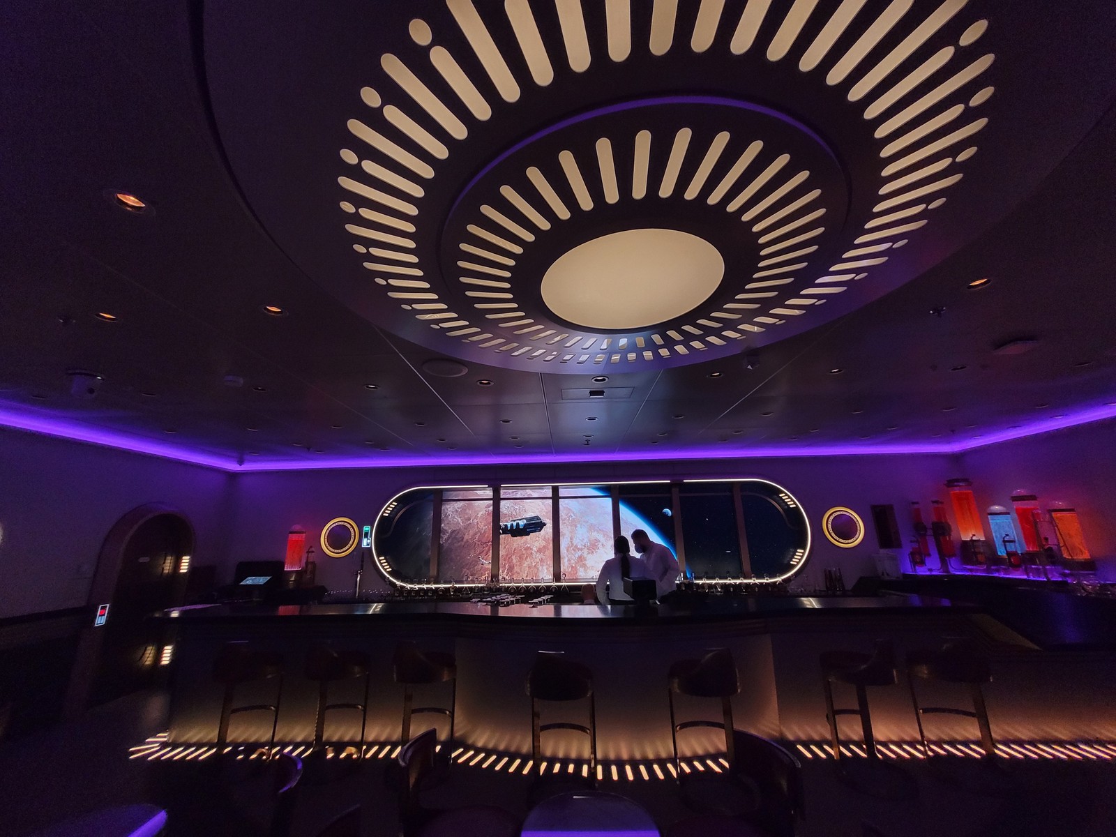 Já o bar Star Wars: Hyperspace Lounge,uma novidade do Disney Wish,parece estar numa nave de 'Guerra nas estrelas'