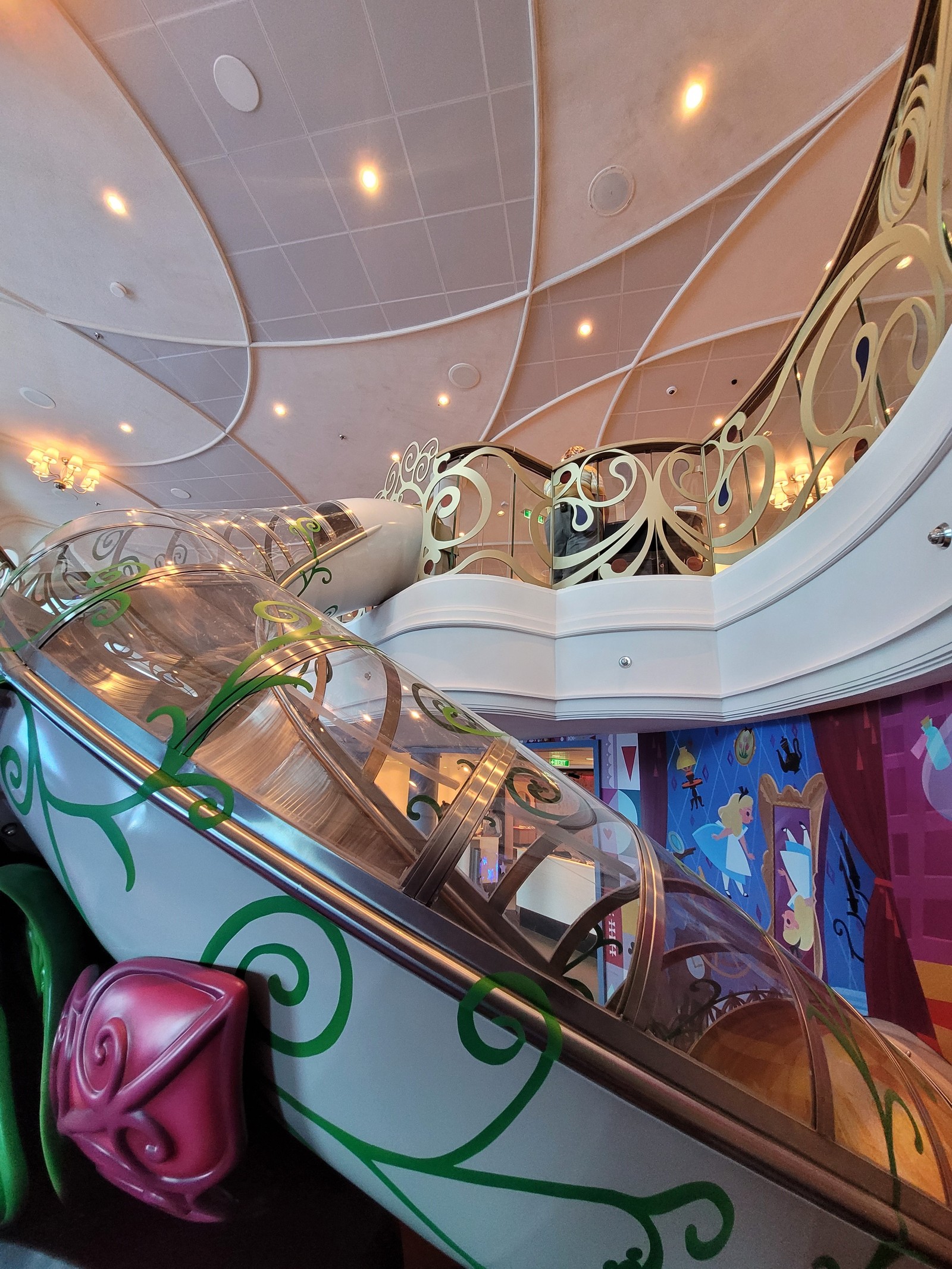 As crianças podem deslizar do Grand Hall para o Oceaneer Club neste escorregador,outra novidade do Disney Wish