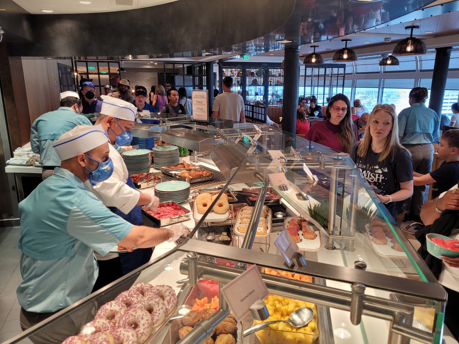 Serviço de café da manhã no Marceline Market,o bufê do Disney Wish: protocolos para Covid-19 seguem em vigor
