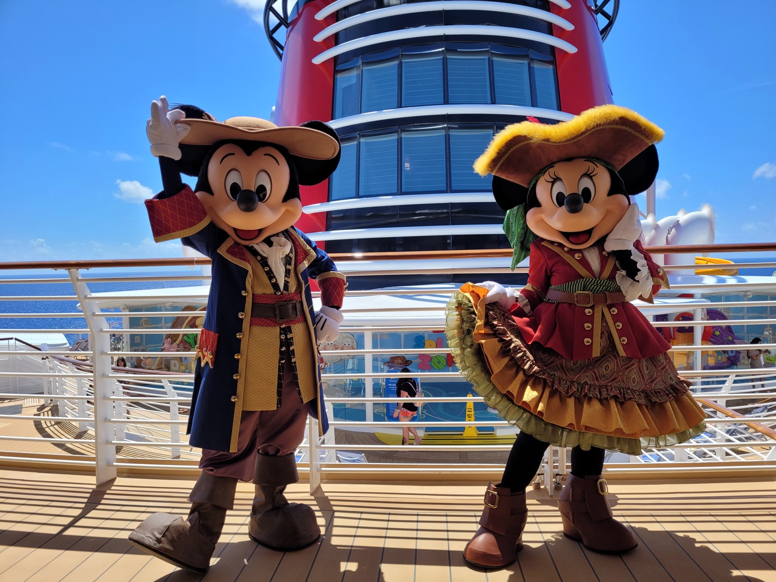 Mickey e Minnie vestidos de pirata saúdam os passageiros do Disney Wish,o mais novo navio de cruzeiros da Disney Cruise