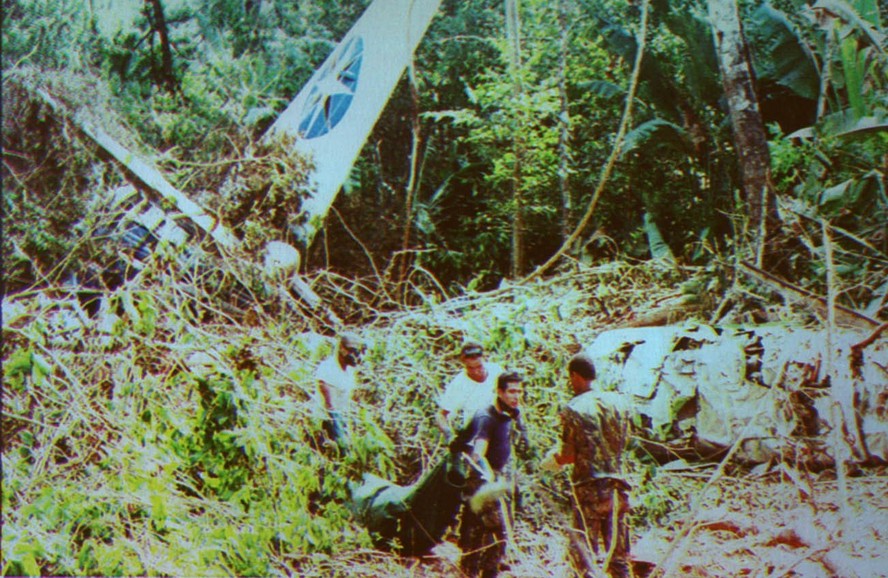 Socorristas removem corpo de local de acidente na selva amazônica,em 1989 — Foto: Sérgio Marques/Agência O GLOBO