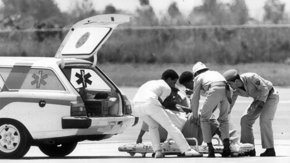 Sobreviventes do acidente com o Boeing da Varig após resgate na selva,em 1989 — Foto: Mino Pedrosa