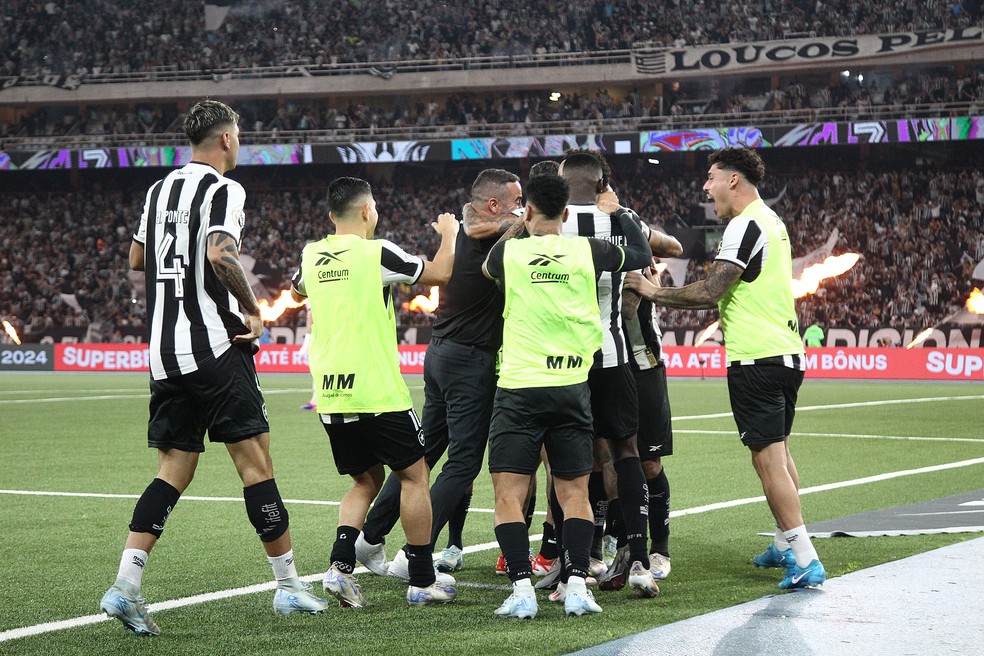 Jogadores do Botafogo comemoram,junto de Artur Jorge,o gol do time contra o Fortaleza — Foto: Vítor Silva/Botafogo