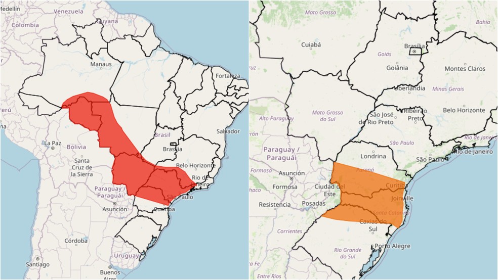 O alerta de onda de calor do Inmet atinge os estados de Rondônia,Mato Grosso,Mato Grosso do Sul,São Paulo,além de partes do Rio de Janeiro,Minas,e do Amazonas. Nestas áreas,o instituto emitiu um alerta vermelho de "grande perigo". Já no Sul,um alerta de menor gravidade,de "perigo",deve afetar Santa Catarina e partes do Paraná e do Rio Grande do Sul. O aviso de onda de calor se iniciou na segunda-feira e deve se estender por um período de três dias. Com a baixa umidade,as temperaturas podem superar os 40ºC em algumas cidades.