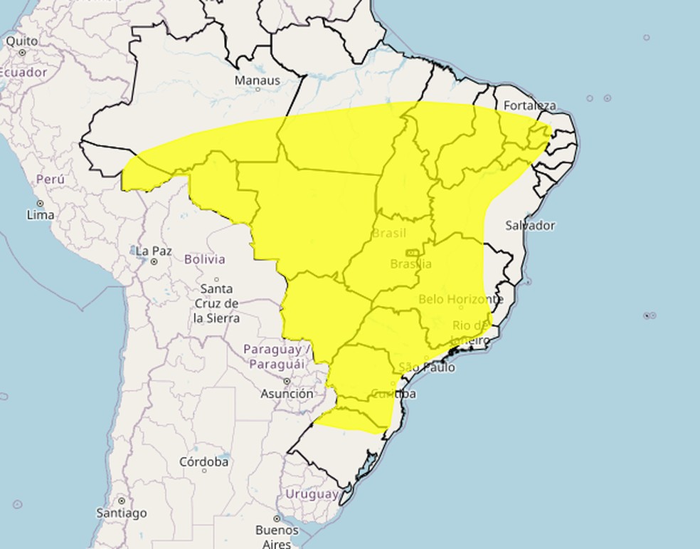 O alerta emitido pelo Inmet recai sobre 21 estados: Acre,Amazonas,Pará,Rondônia,Tocantins,Ceará,Maranhão,Piauí,Rio Grande do Norte,Paraíba,Pernambuco,Bahia,Minas Gerais,Rio de Janeiro,Paraná,Santa Catarina,Rio Grande do Sul,Goiás e Distrito Federal.