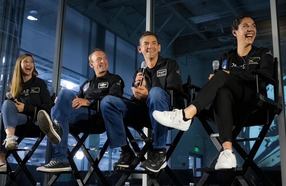 Tripulação da missão Polaris Dawn em coletiva de imprensa — Foto: Divulgação