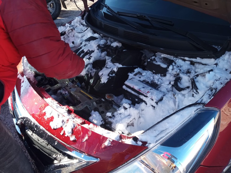 Motor do carro foi tomado pela neve — Foto: Acervo pessoal