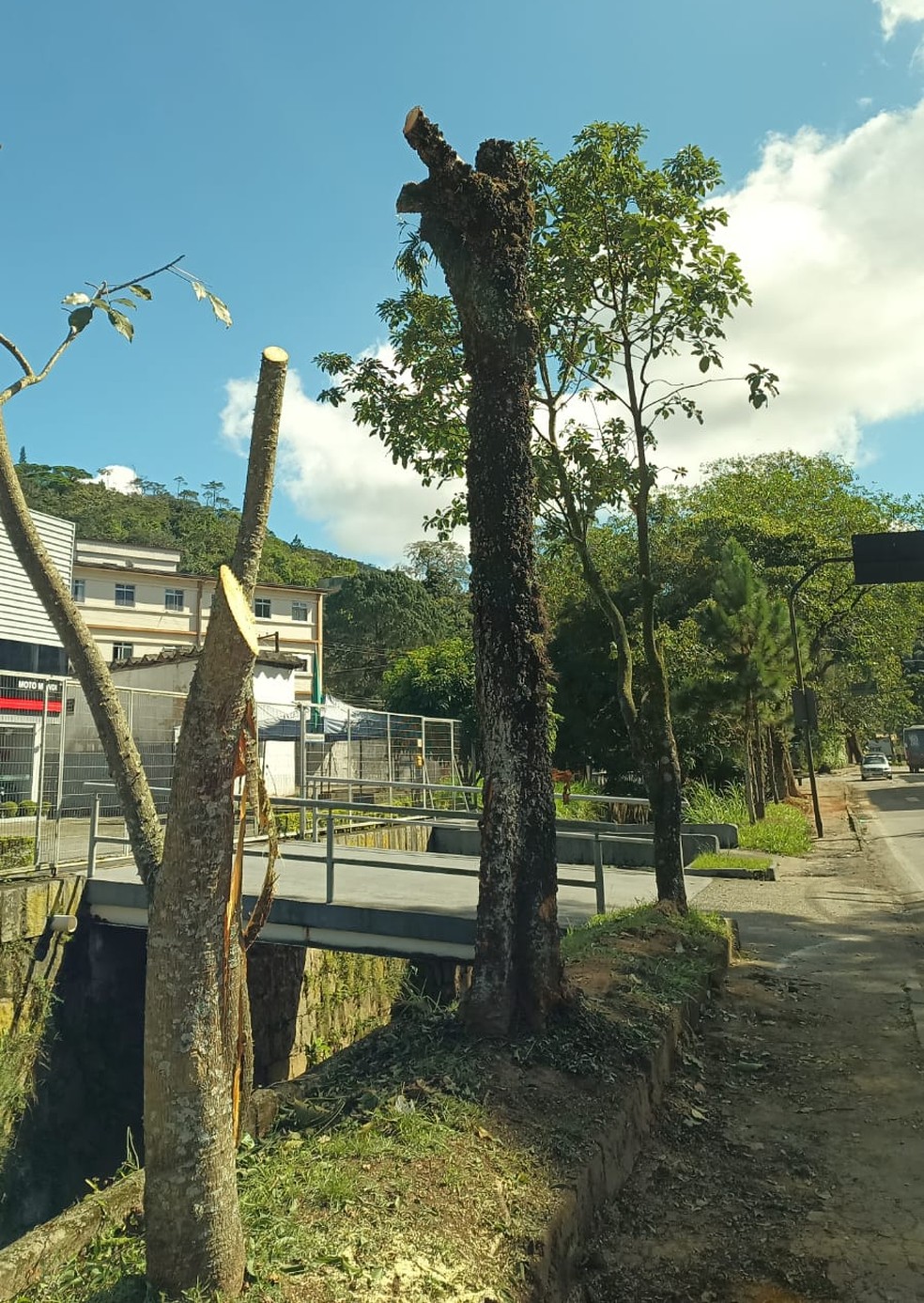 Poda de árvores feita em frente ao Hospital Alcides Carneiro,em Corrêas — Foto: Rogério Guimarães