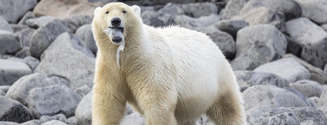 Imagem de urso polar com pedaço de plástico preso à boca é finalista em concurso anual de fotografia oceânica — Foto: Célia Kujala