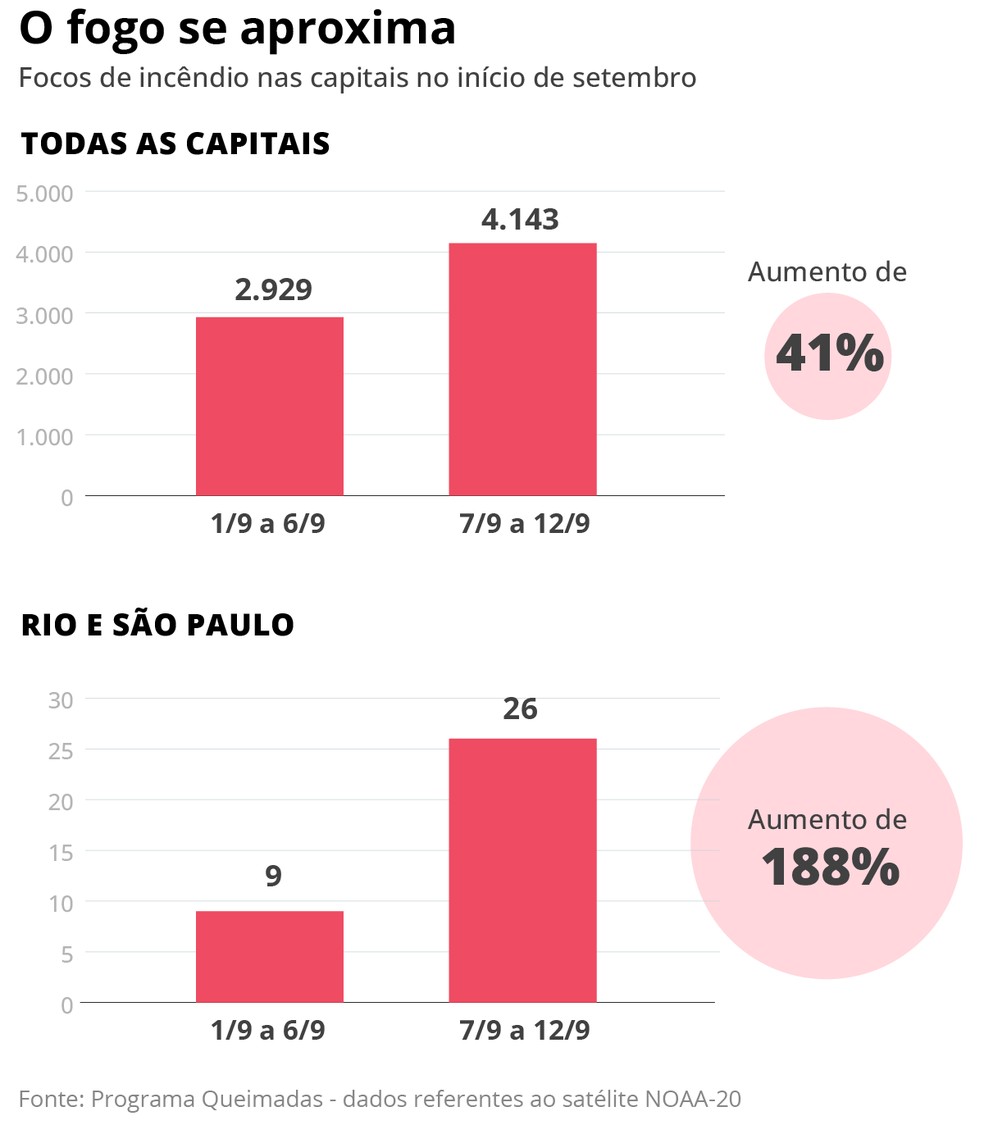 A detecção de focos de incêndio em capitais brasileiras aumentou 41% na última semana,aponta um levantamento feito pelo GLOBO com dados divulgados pelo Instituto Nacional de Pesquisas Espaciais (Inpe). Na primeira semana de setembro,quando a crise de queimadas em todo o país começou a se acentuar,foram identificadas 2,9 mil em capitais,número que subiu para 4,1 mil na semana seguinte. Regiões metropolitanas que têm áreas verdes,como as de Rio e São Paulo,registraram ontem focos em morros e matas que ameaçaram áreas urbanas.