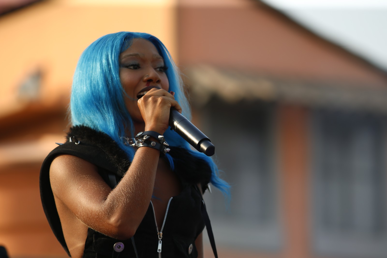 Com um lace azul,Slipmami se apresentou no Palco Favela,no Rock In Rio 2024 — Foto: Fabiano Rocha