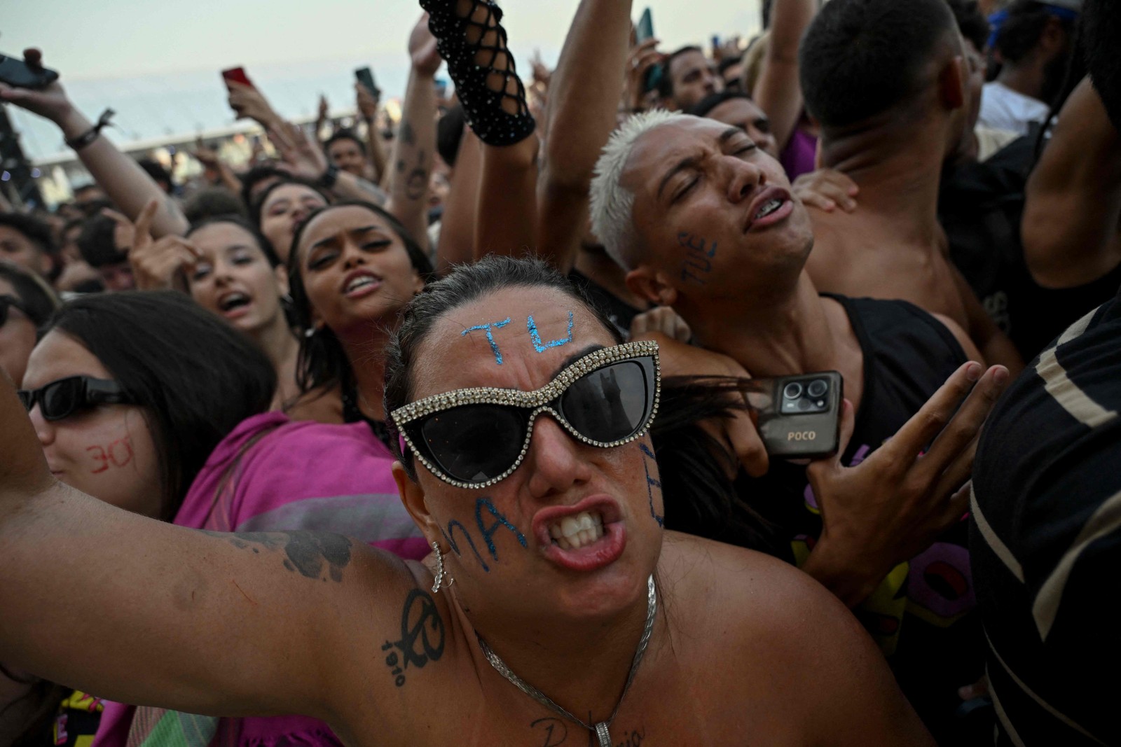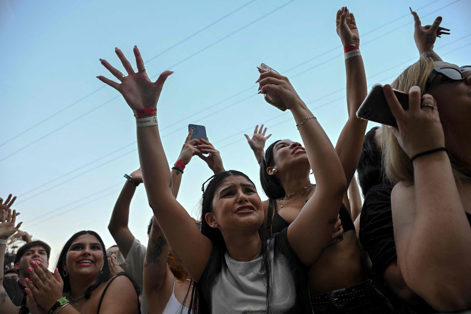 Fãs cantando no primeiro dia do Rock In Rio 2024 — Foto: Mauro Pimentel/AFP