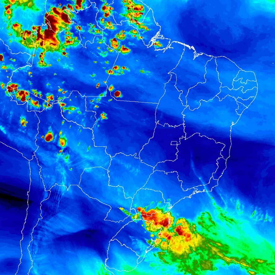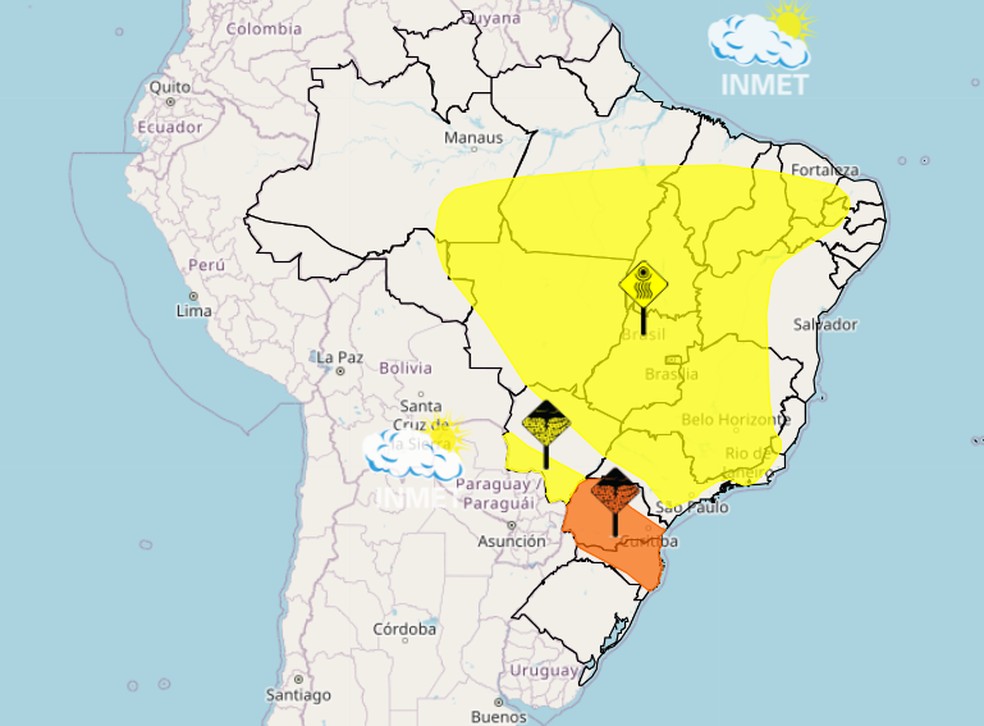 No Sul,os alertas são de tempestade para o sábado. O Inmet prevê "perigo" para o Paraná e para Santa Catarina até a parte da tarde. O aviso indica chuva entre 30 e 60 mm/h,ventos intensos,e queda de granizo. Já no sul de Mato Grosso do Sul,o alerta é de "perigo potencial",menos grave.