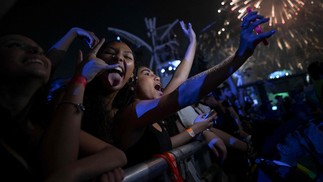 À espera de Travis Scott e 21 Savage,público aprecia o show de fogos no Palco Mundo,no primeiro dia do Rock In Rio 2024 — Foto: Guito Moredo