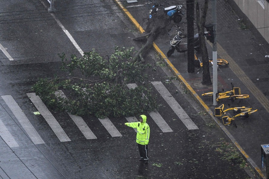 Policial controla o trânsito próximo a uma árvore derrubada por ventos fortes do tufão Bebinca,em Xangai — Foto: Hector RETAMAL / AFP