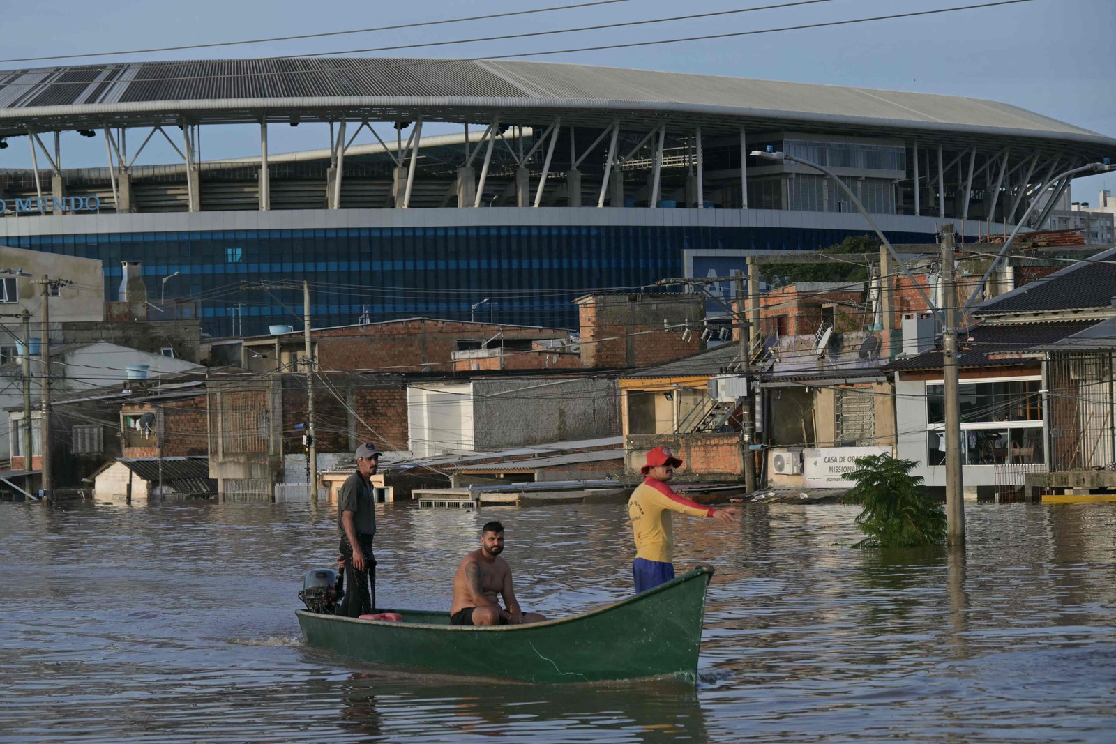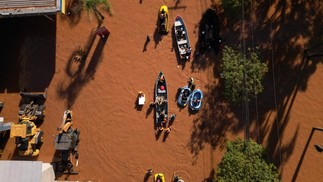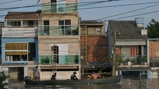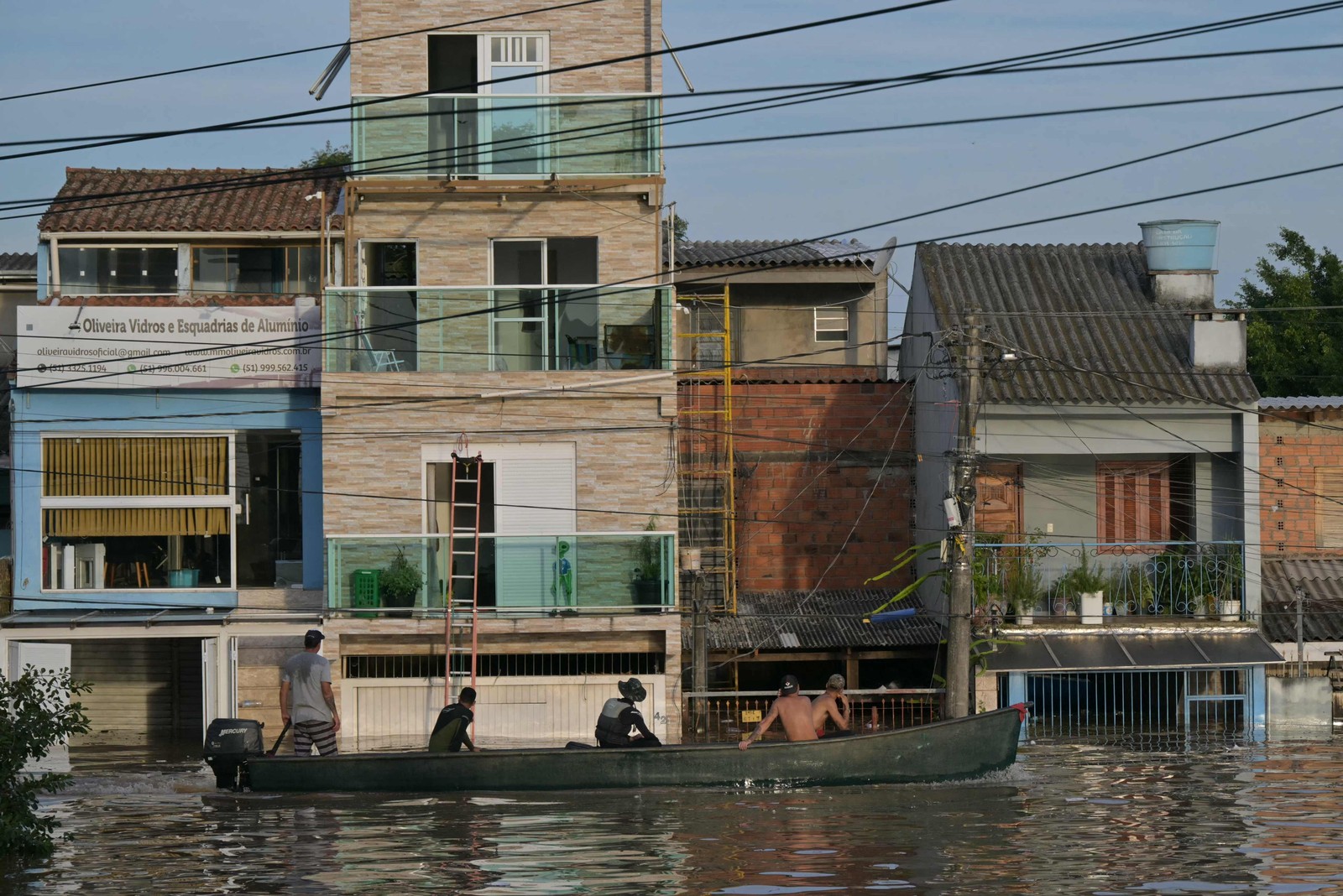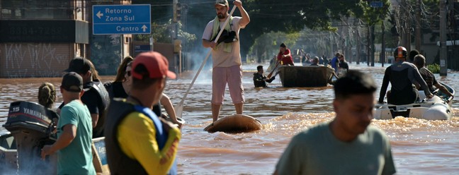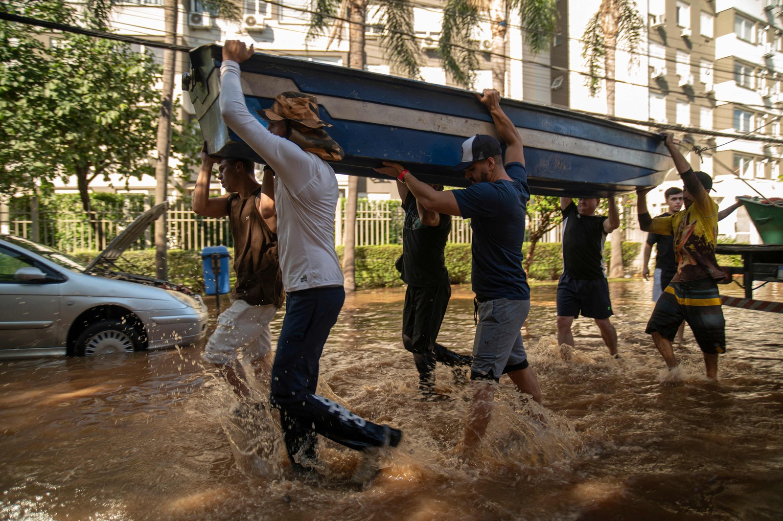 Pessoas participam de operações de resgate em Porto Alegre: chuvas diminuíram,mas inundações permanecem — Foto: Carlos Fabal/AFP