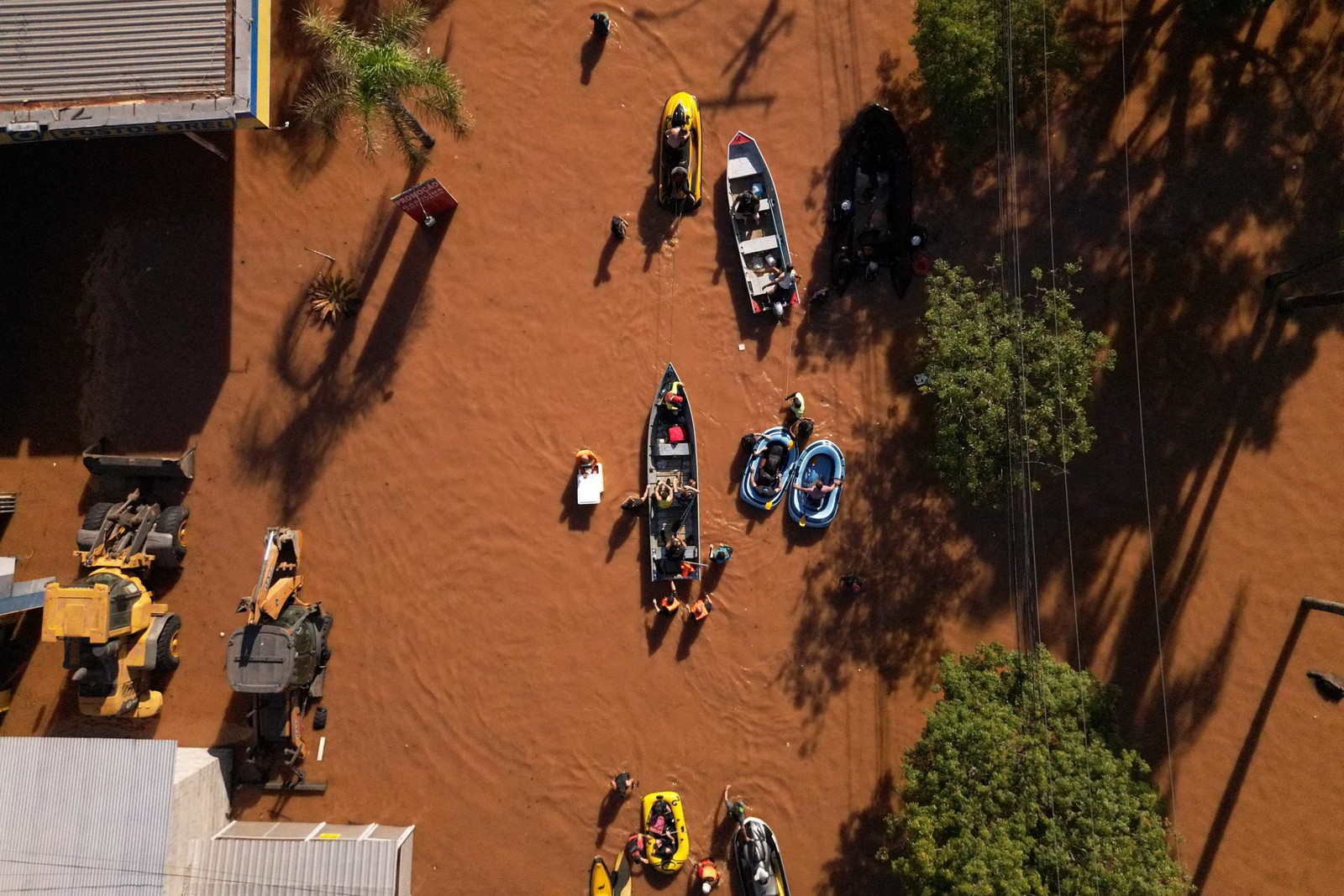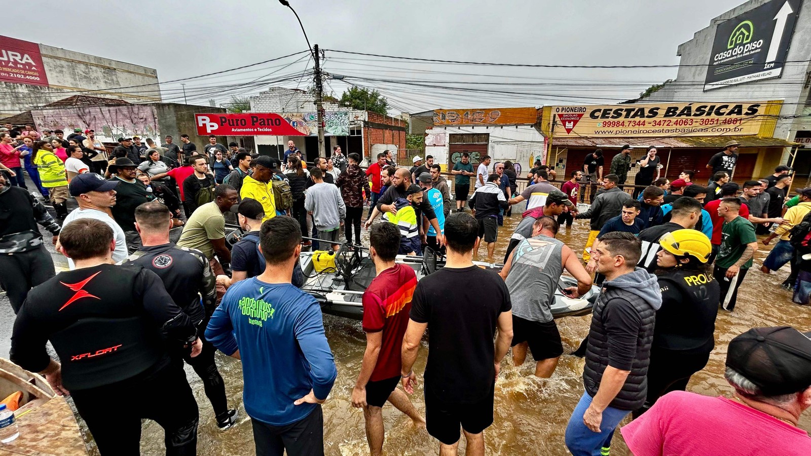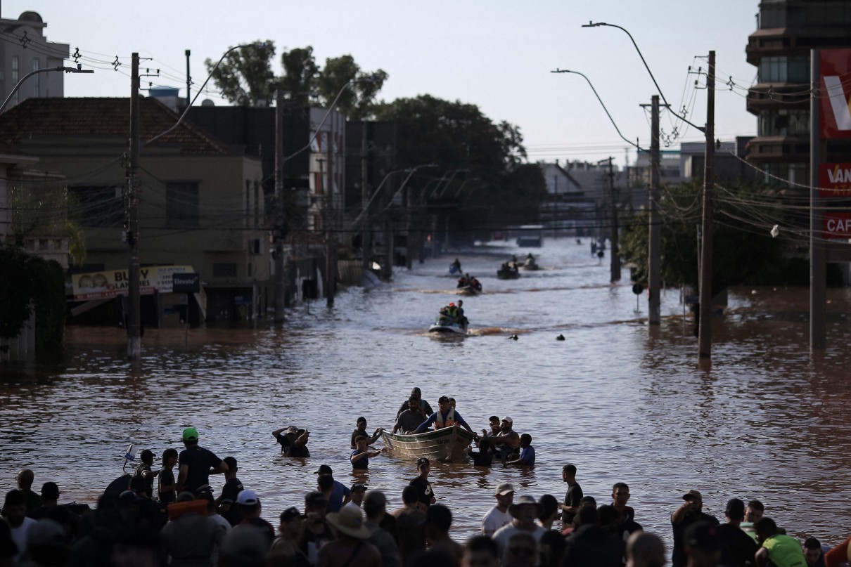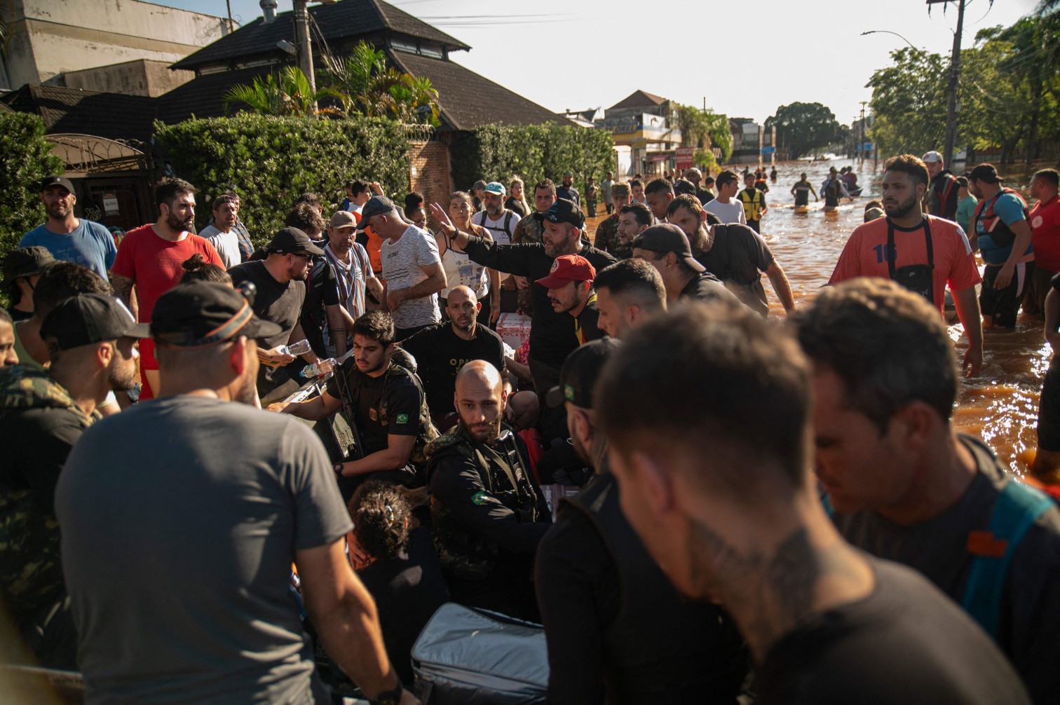 Pessoas participam de operações de resgate em Porto Alegre após tempestades torrenciais no sul do estado do Rio Grande do Sul. — Foto: Carlos FABAL / AFP