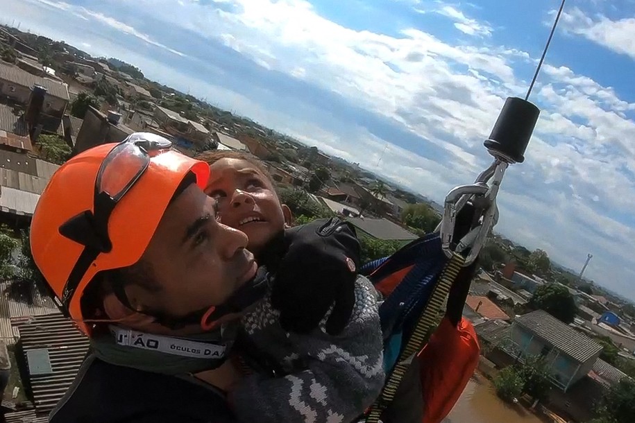 Capturada de um vídeo divulgado pela Marinha do Brasil,em 5 de maio de 2024,mostra resgate de uma criança,por helicóptero,no bairro Mathias Velho,em Canoas,Rio Grande do Sul. De cima a baixo,equipes de resgate vasculham edifícios em Porto Alegre em busca de habitantes presos em apartamentos ou em telhados. — Foto: MARINHA DO BRASIL / AFP