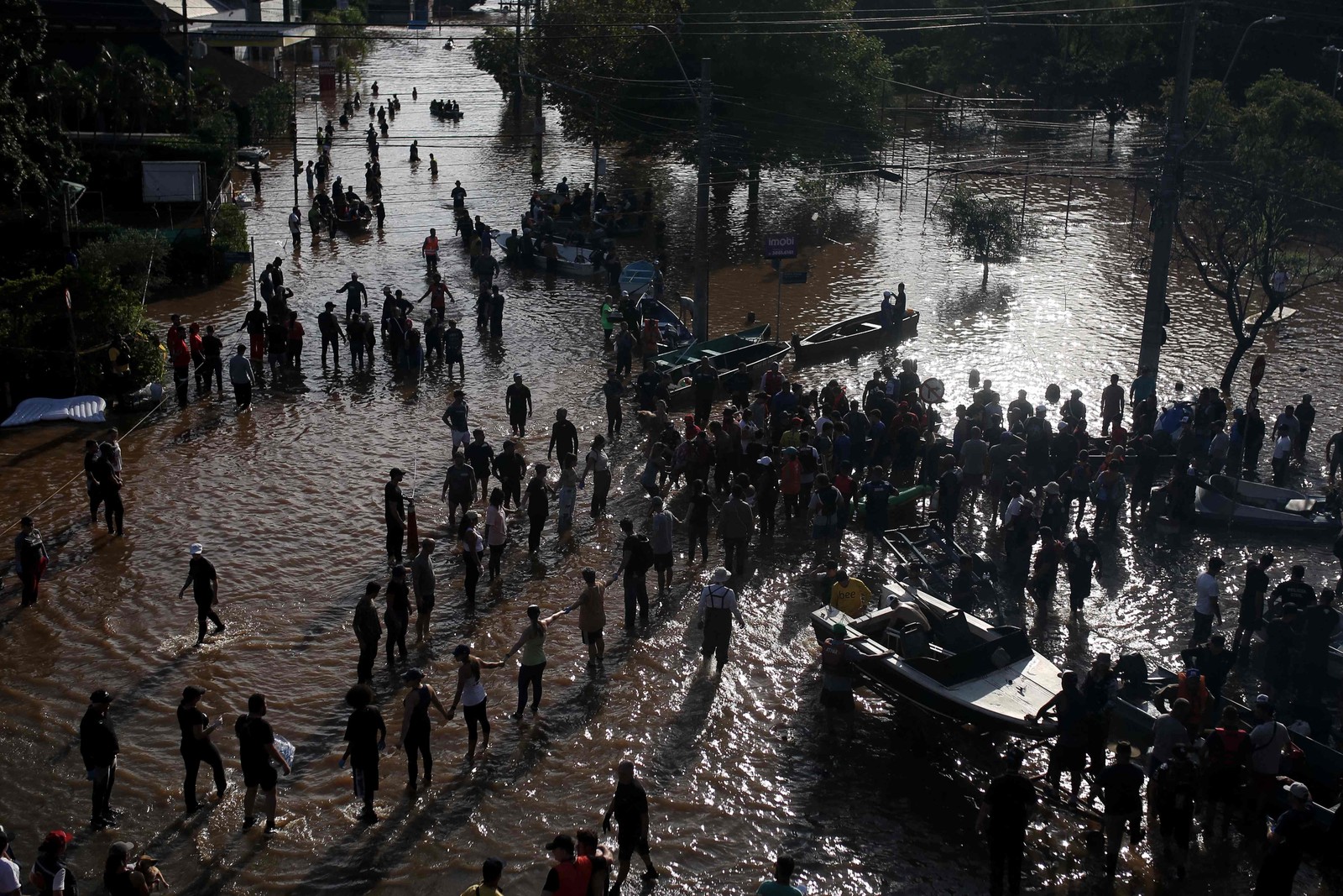 Voluntários formam corredor humano para receber barcos com pessoas resgatadas de áreas alagadas no bairro de São João,Rio Grande do Sul — Foto: Anselmo CUNHA / AFP