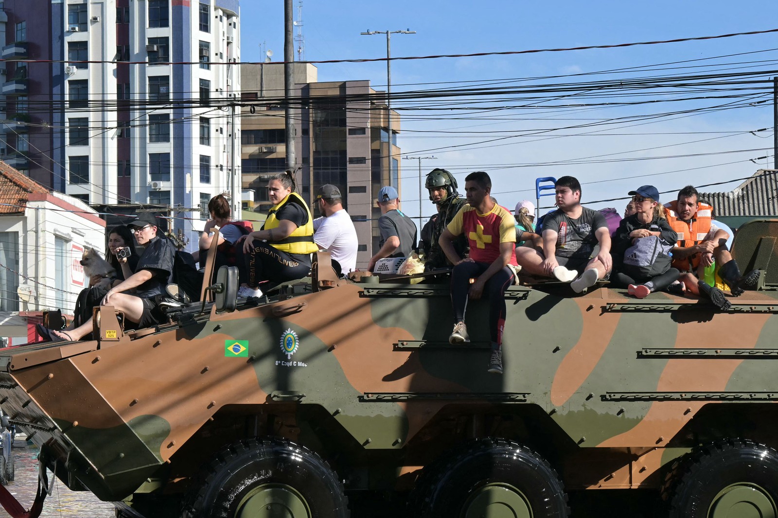 Pessoas são retiradas de uma área inundada em um veículo militar após enchentes causadas por fortes chuvas em Porto Alegre,Rio Grande do Sul. — Foto: NELSON ALMEIDA / AFP