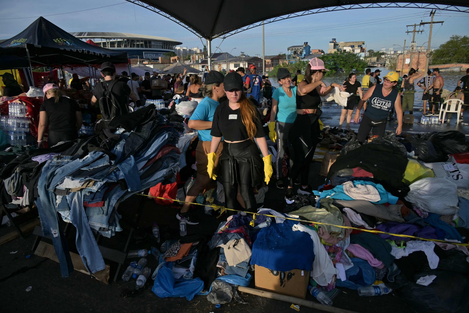 Um voluntário organiza roupas doadas para serem distribuídas entre os evacuados das enchentes,no bairro Humaitá,Rio Grande do Sul — Foto: NELSON ALMEIDA / AFP