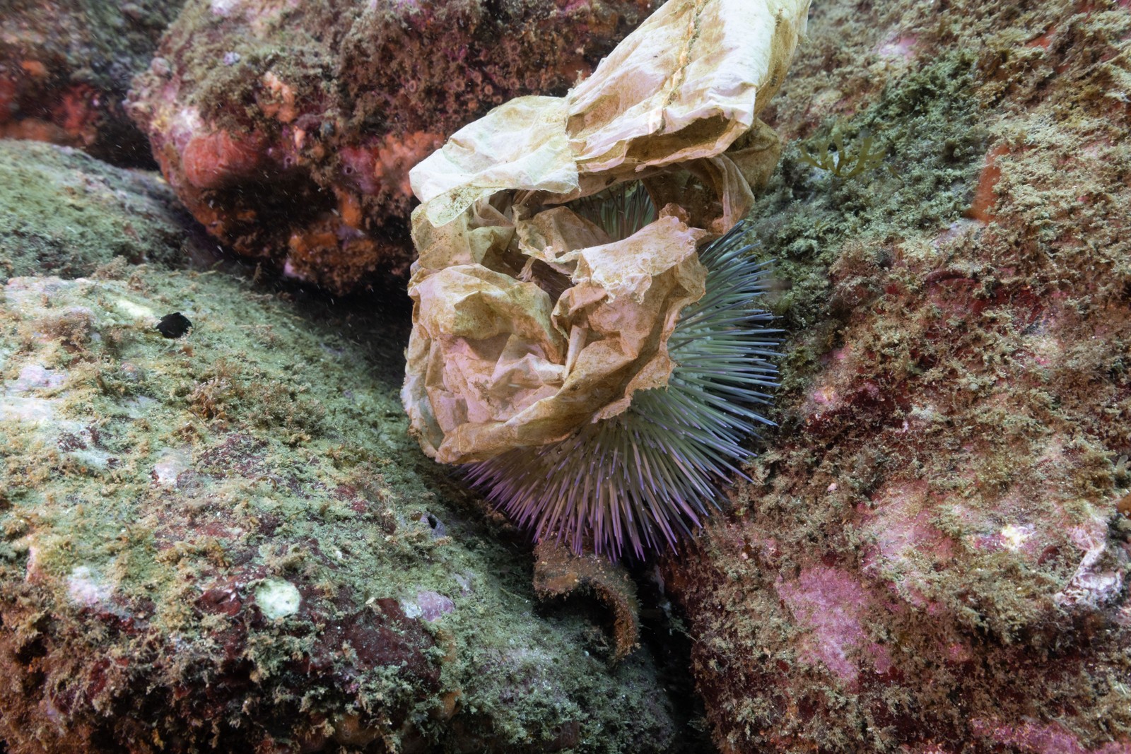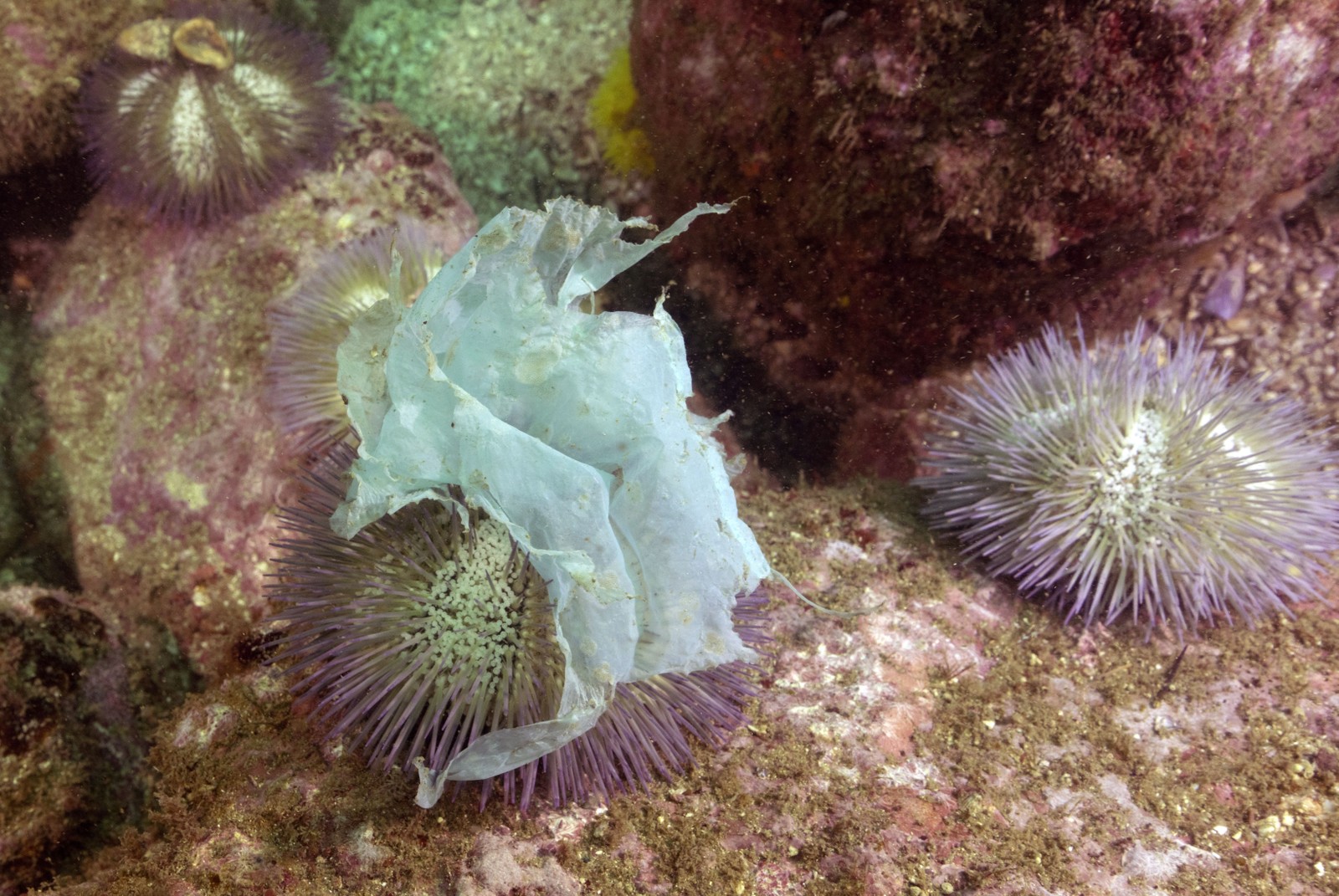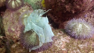 Danos. Ouriços-do-mar cobertos com plástico: o estudo mostrou a contaminação dessa e de outras espécies — Foto: Ricardo Gomes / Instituto Mar Urbano