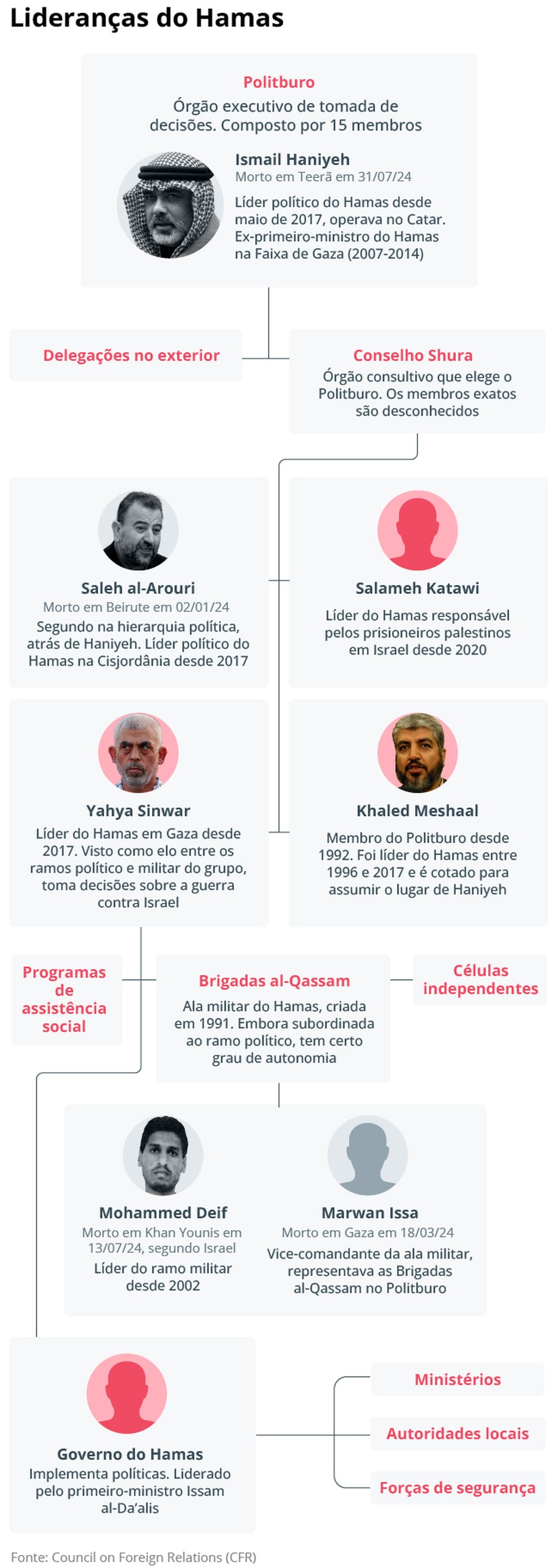 Liderança do grupo terrorista Hamas é dividida entre política e militar; desde o início da guerra contra Israel,o Estado judeu prometeu aniquilar a organização — Foto: Editoria de Arte