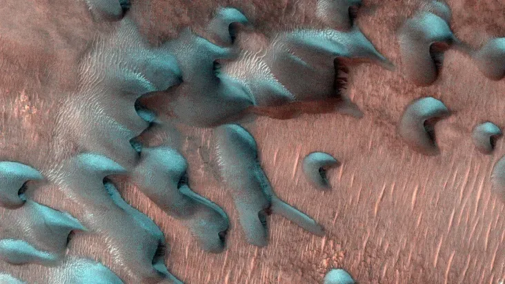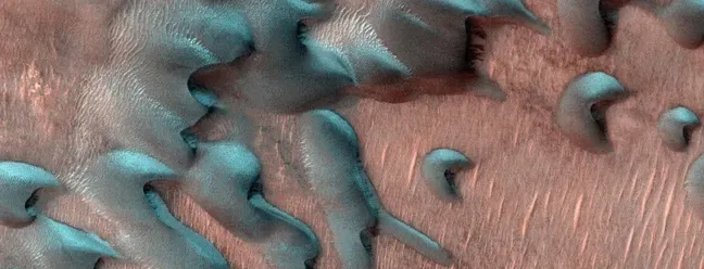 Imagem mostra um campo de dunas polares único durante a primavera do Norte,revelando alguns padrões interessantes — Foto: Crédito: NASA/JPL-Caltech/University of Arizona