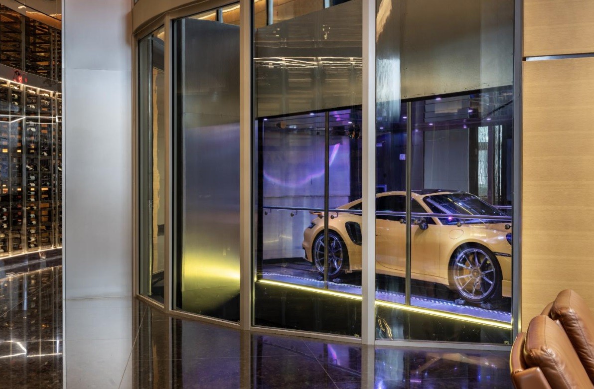 O Dezervator,elevador que transporta carros e motoristas por 60 andares até garagens altíssimas de vidro na torre Porsche Design,em Sunny Isles Beach — Foto: Scott Baker/The New York Times