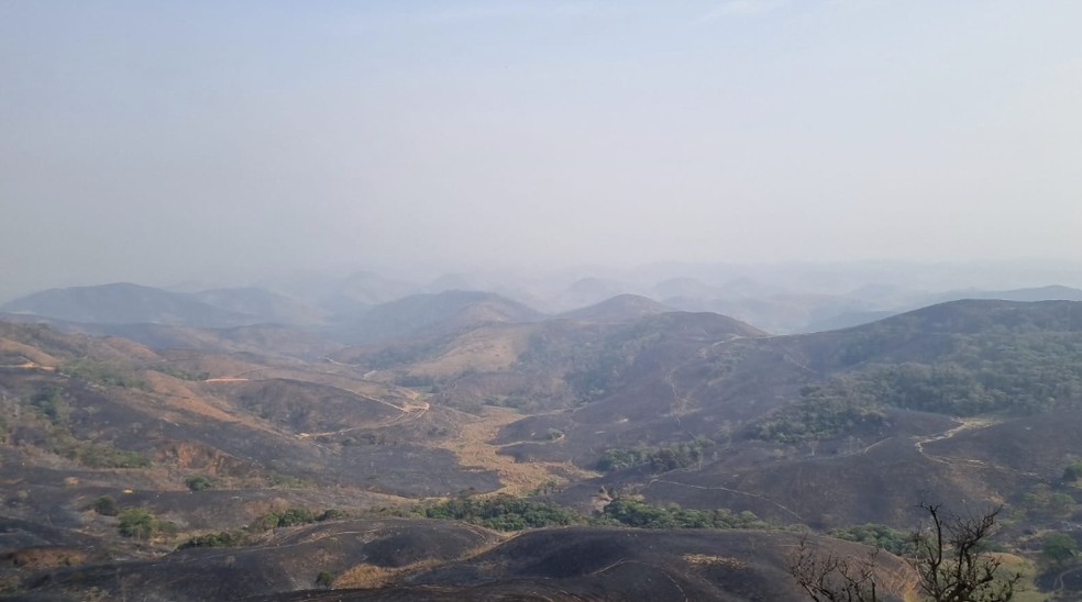Serra da Beleza,em Valença,no último domingo,dia 15,após o incêndio que devastou parte do Parque — Foto: Inea