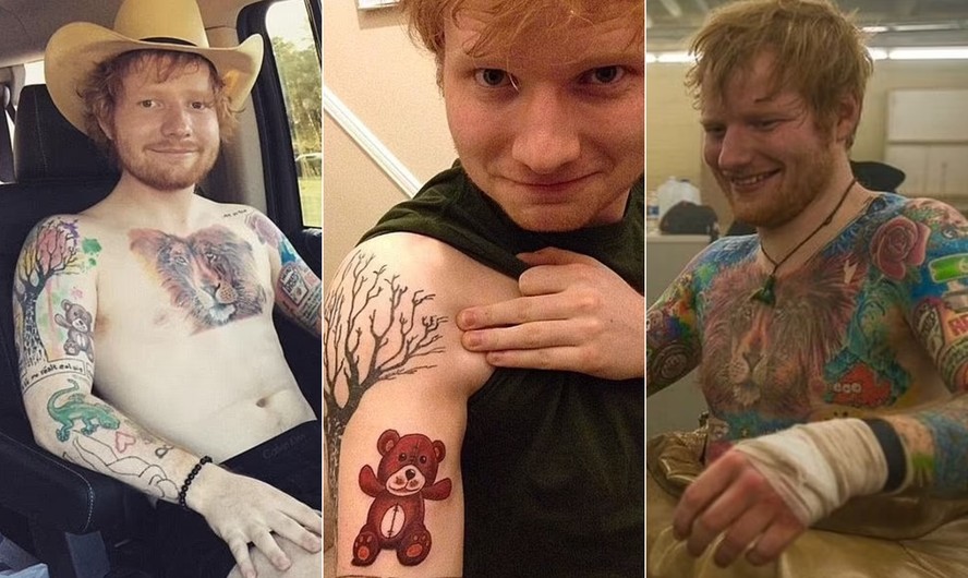 Além de colecionar hits como "Thinking out loud" e "Shape of you" e milhões de seguidores nas redes sociais,o cantor britânico Ed Sheeran,de 33 anos,tem uma coleção de respeito de tatuagens. O artista conta com mais de 60 tatoos em seu corpo,tendo passado por mais de 40 horas de sessões para marcar todas em seu corpo.