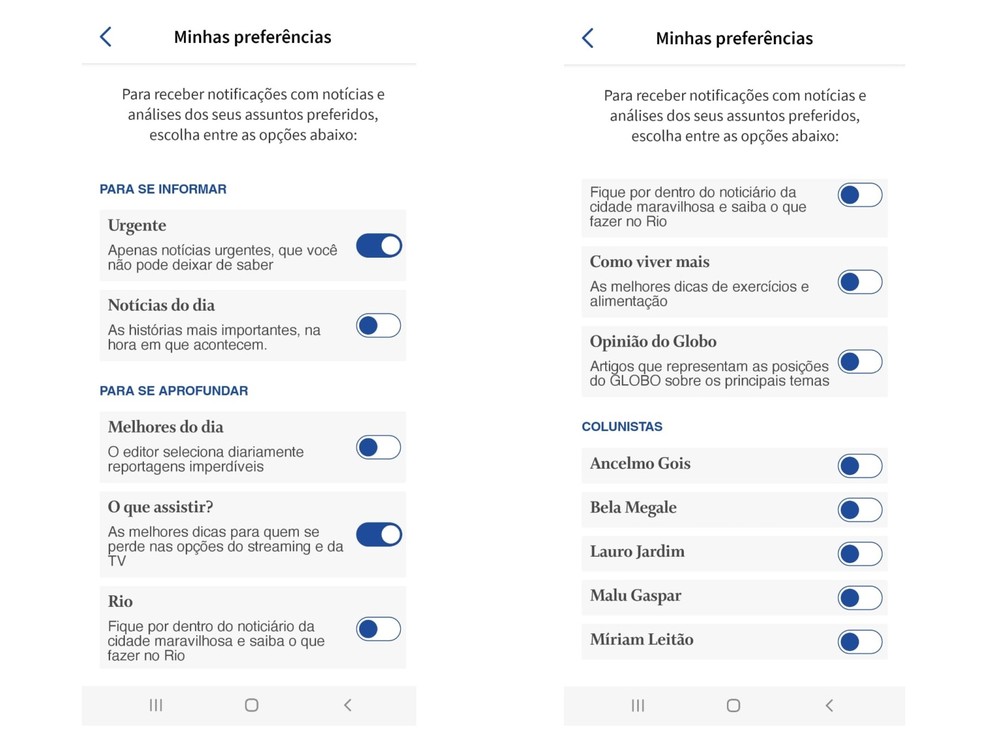 O noticiário foi dividido em três categorias: 1) para se informar,2) para se aprofundar e 3) colunistas. No primeiro grupo,você pode escolher se quer ser avisado só das notícias urgentes,na hora em que elas acontecem,ou se também quer receber um push com as principais histórias e ficar mais bem informado ao longo do dia.