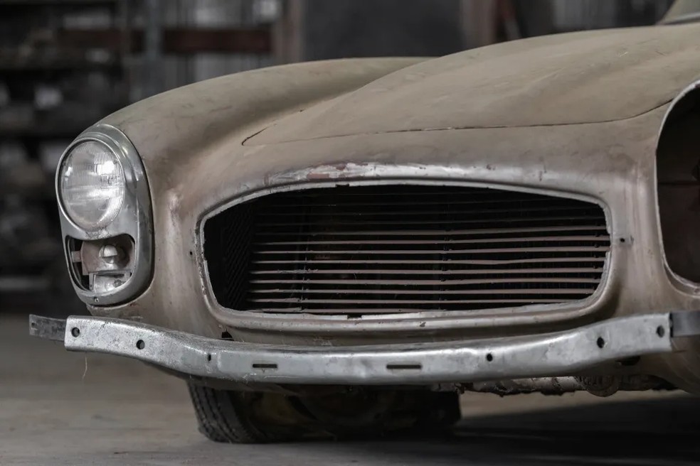 O veículo é apenas um dos 30 carros raros que tem um conjunto de rodas Rudge derivadas de competição automobilística. O Mercedes-Benz 300 SL Roadster de 1957 precisa de uma restauração após décadas de abandono.