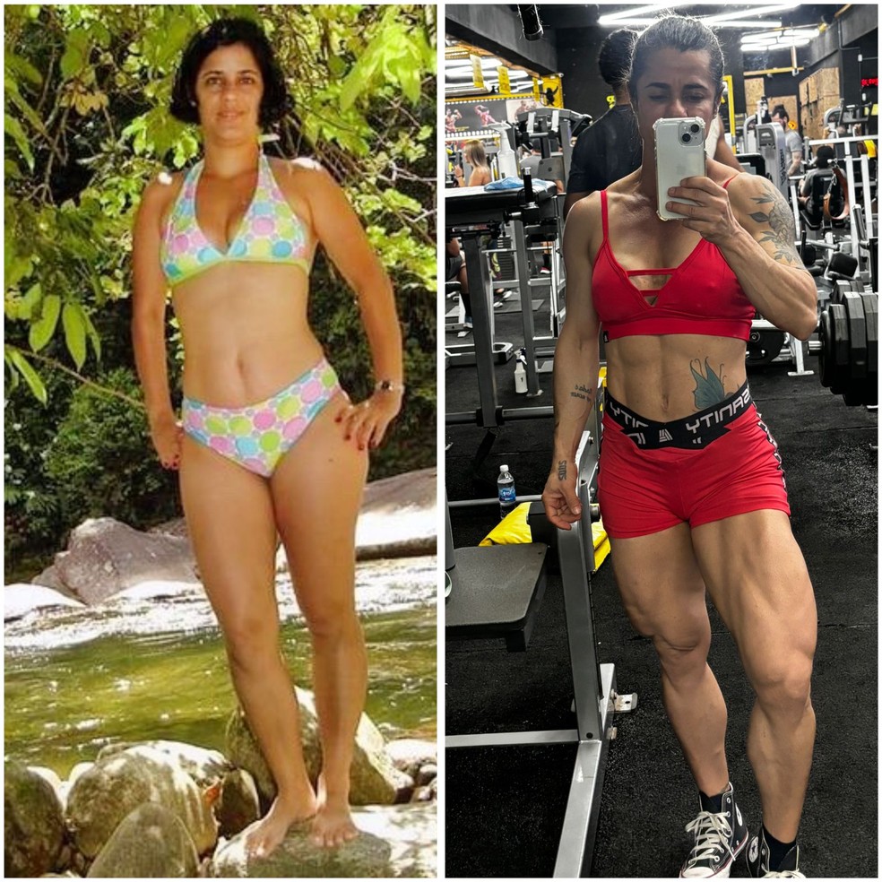 Antes e depois da rotina de exercícios físicos que mudou a vida fisiculturista Débora Pereira — Foto: Acervo pessoal