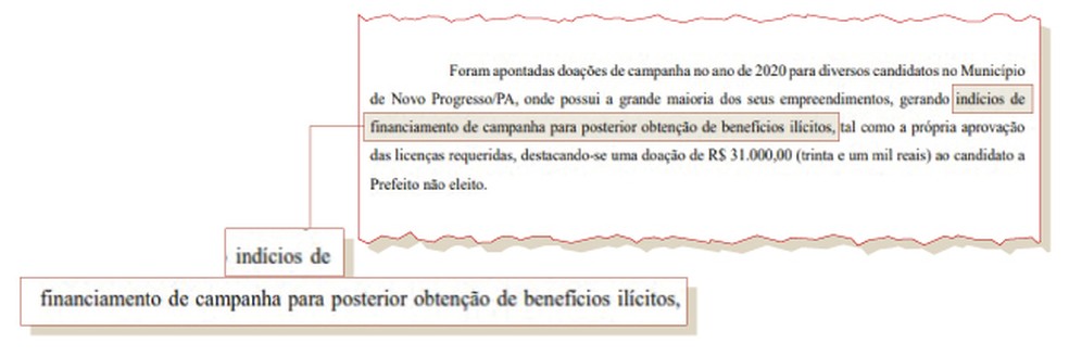 “Foram apontadas doações de campanha no ano de 2020 para diversos candidatos no município de Novo Progresso (PA),onde possui a grande maioria dos seus empreendimentos,gerando indícios de financiamento de campanha para posterior obtenção de benefícios ilícitos,tal como a própria aprovação das licenças requeridas”,pontua o relatório da investigação.
