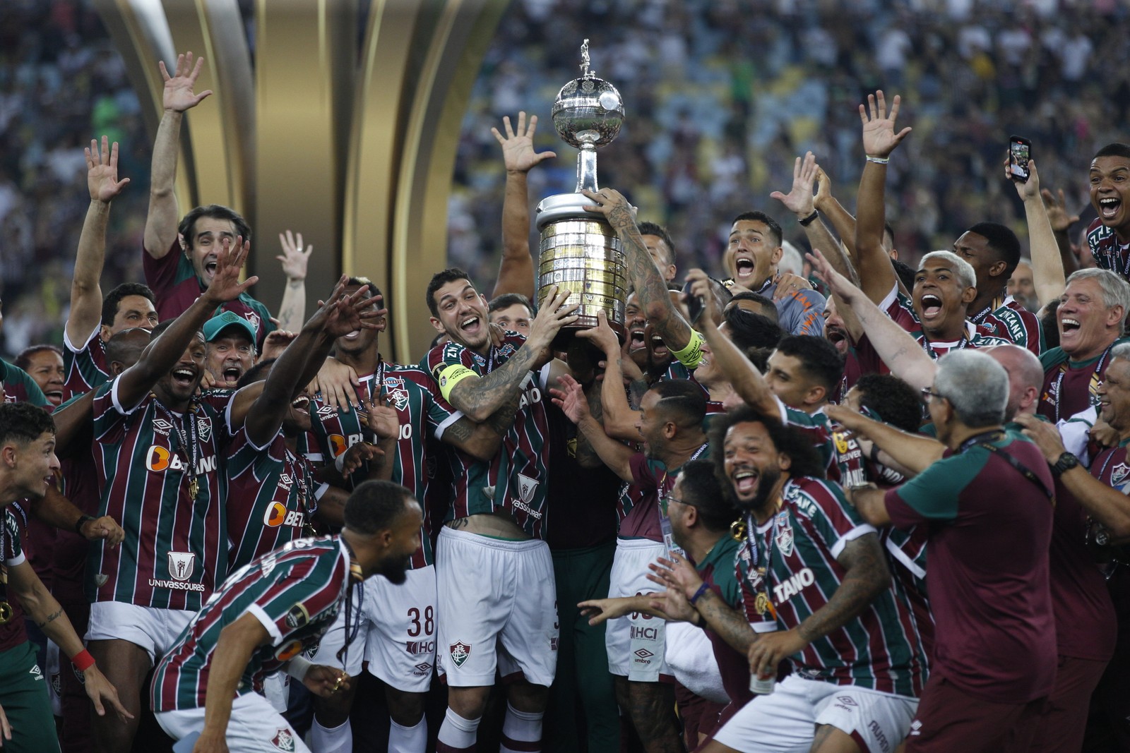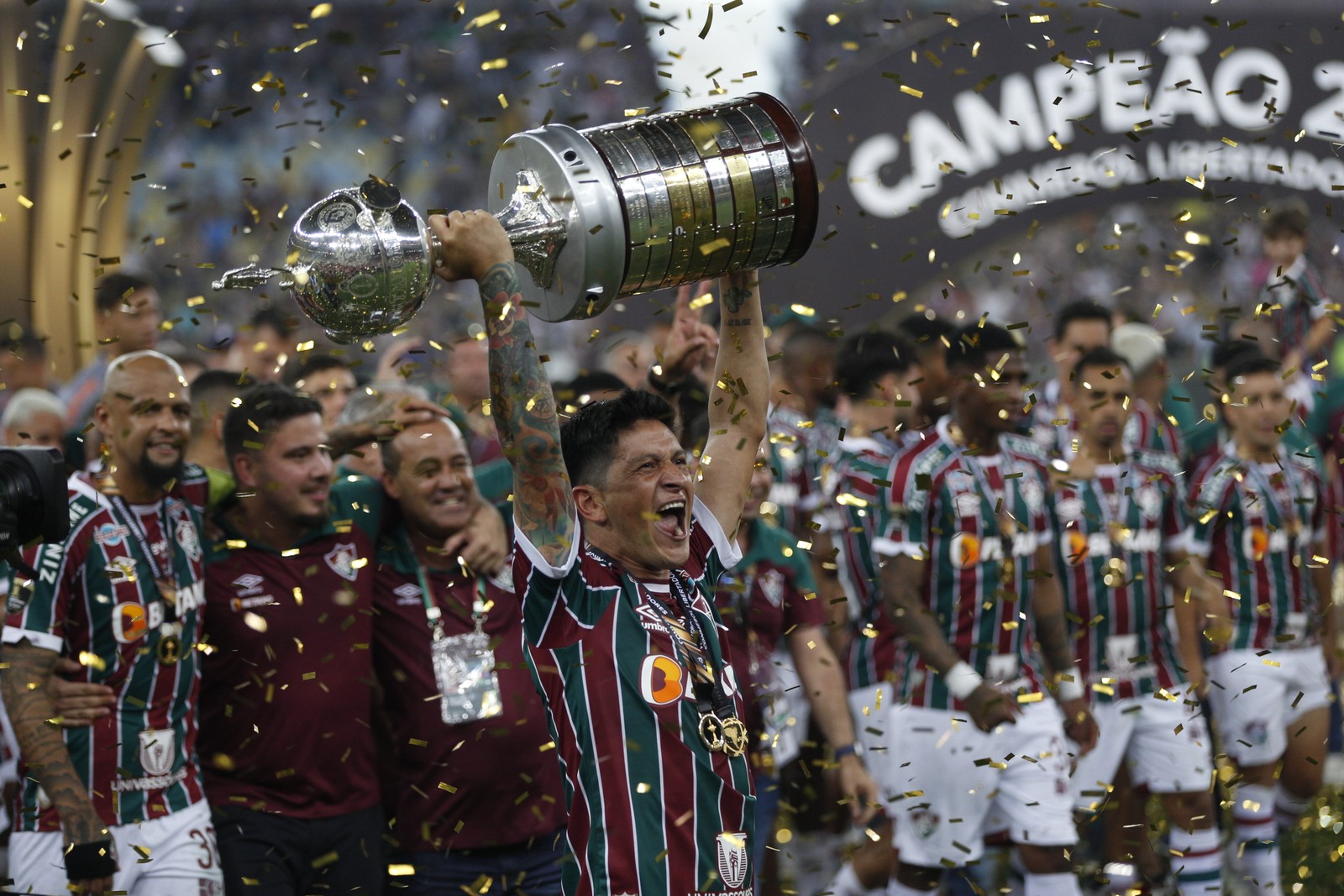 Copa Libertadores 2023 - Jogo da final entre Boca Juniors x Fluminense no Maracanã. Jogadores levantam a taça. — Foto: Alexandre Cassiano / Agência O Globo