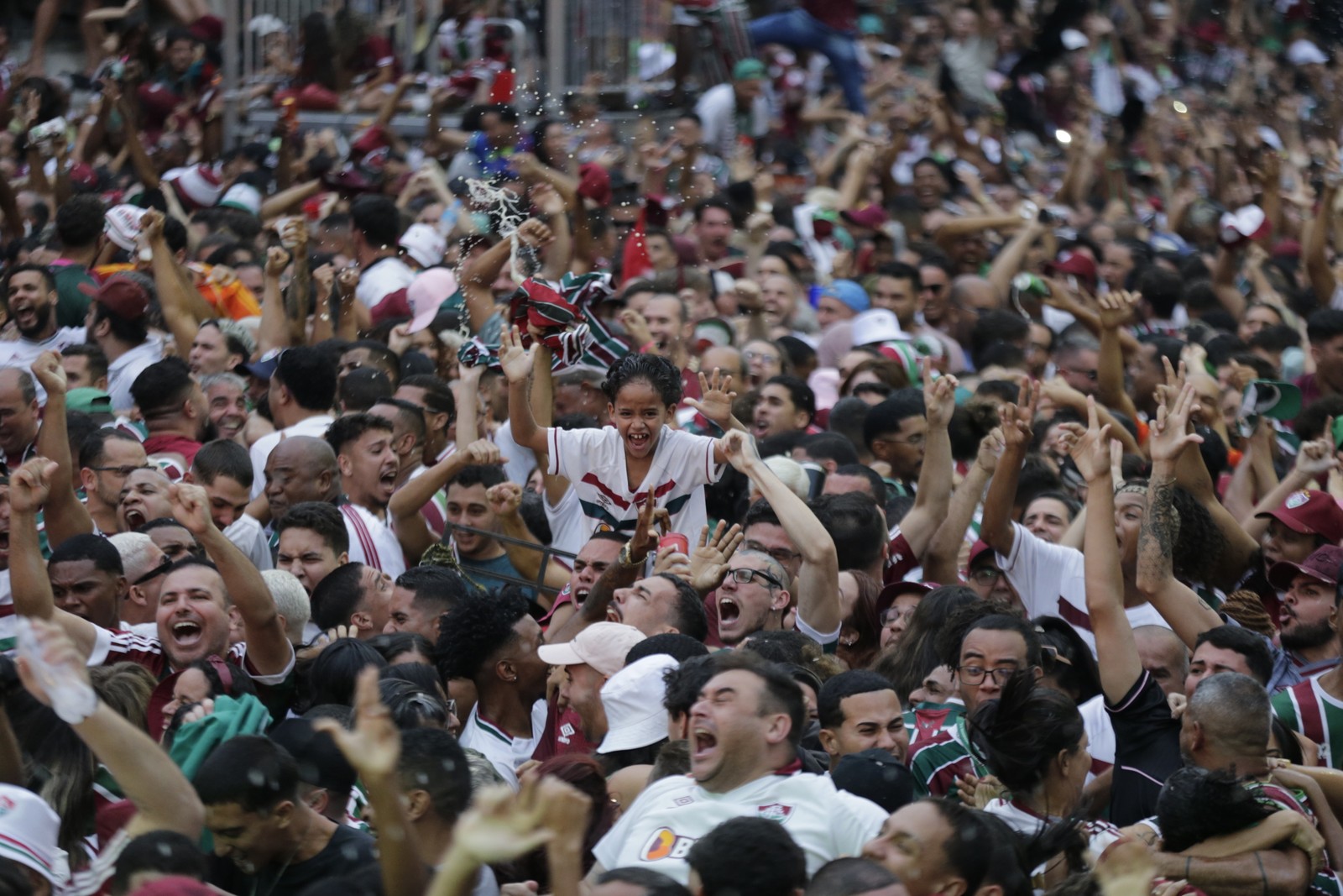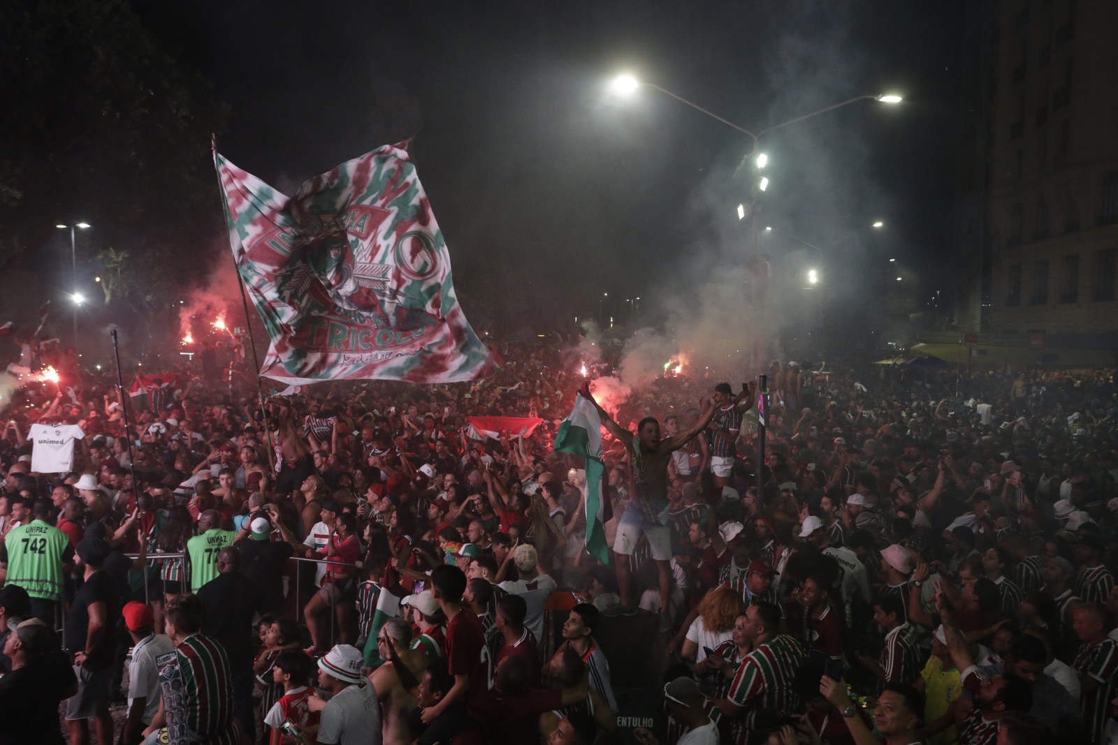 Final da Copa Libertadores - Fluminense x Boca Juniors - Torcedores do Fluminense comemoram o título tricolor na Cinelândia. — Foto: Domingos Peixoto / Agência O Globo