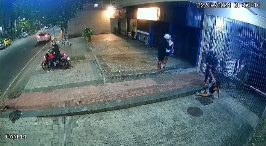 O vídeo de um assalto divulgado em grupos de condomínios de Botafogo mostra o que os moradores estão enfrentando no bairro. Eram quase 2h de domingo,quando dois rapazes foram cercados por quatro bandidos em duas motos no início da Rua Real Grandeza,a menos de 300 metros do Palácio da Cidade. Dois dos criminosos desceram dos veículos — um deles armado —,exigiram os celulares das vítimas e,aparentemente,fizeram com que elas fornecessem as senhas. A abordagem foi violenta. Os jovens foram agredidos com tapas no rosto e um deles,derrubado no chão duas vezes. O ataque deixou quem vive no bairro ainda mais assustado.