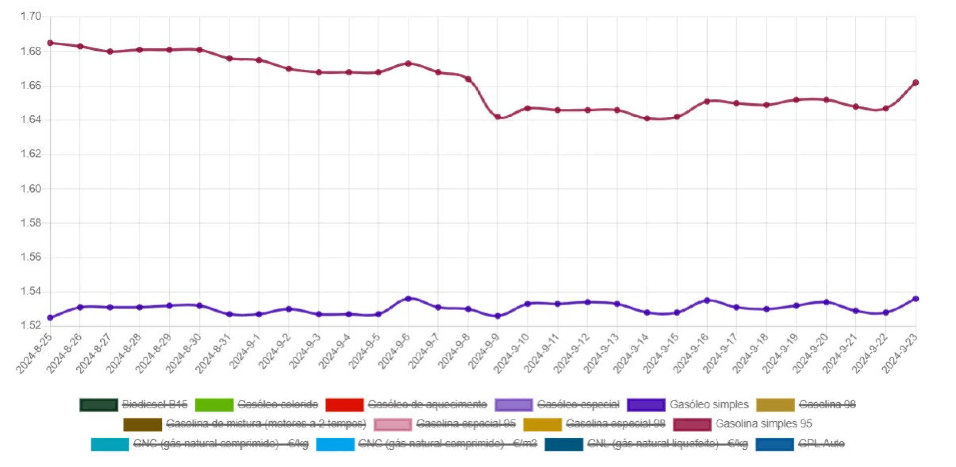 De acordo com os dados da Direção-Geral de Energia e Geologia (DGEG),na segunda-feira,23 de setembro,o preço médio do gasóleo simples mantinha-se praticamente inalterado,estando nos 1,536 euros por litro,enquanto o da gasolina simples 95 aumentou um cêntimo para os 1,662 € euros por litro.