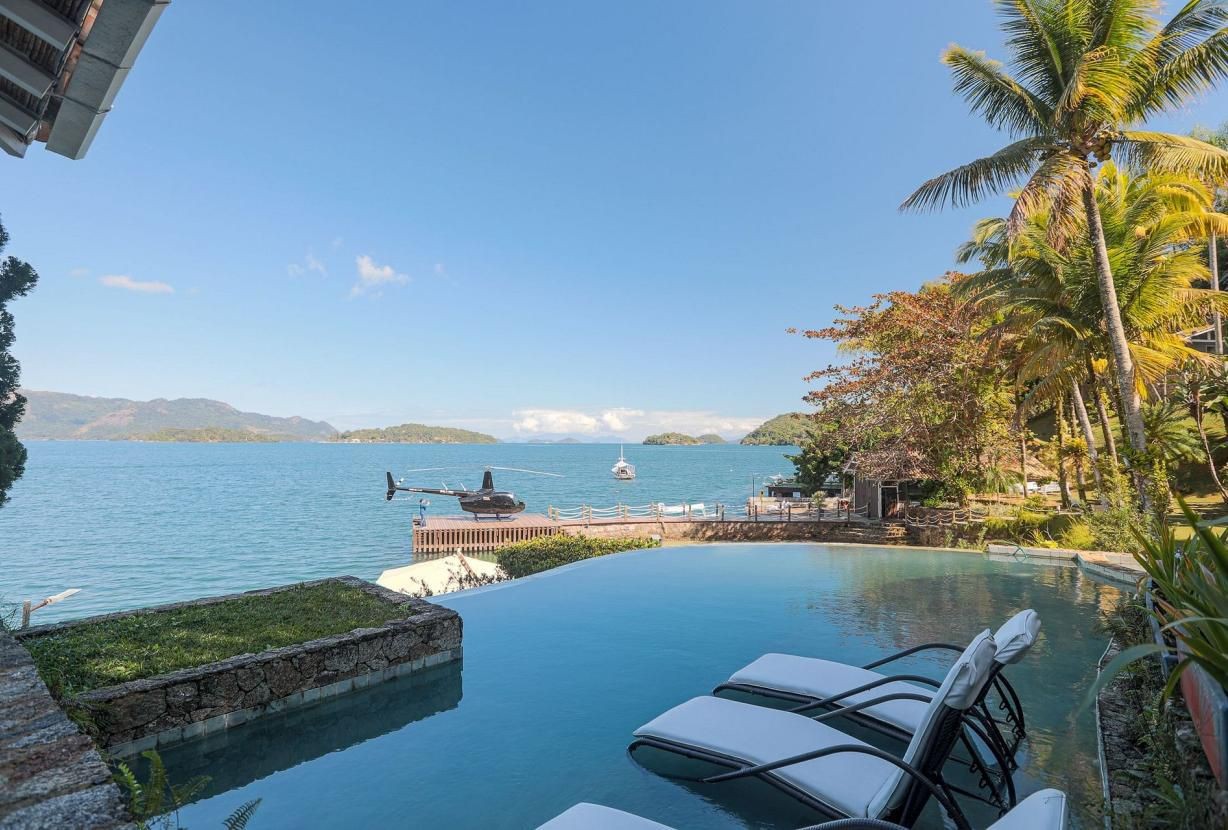 Piscina no deck e heliponto em ilha em Angra dos Reis disponível para locação por uma média de R$ 35 mil por diária — Foto: Divulgação
