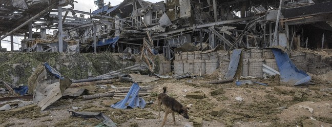 Um cão de rua caminha pelos destroços do posto de fronteira russo destruído no Cruzamento de Sudzha,em Kursk,Rússia,em 24 de agosto de 2024 — Foto: David Guttenfelder/The New York Times