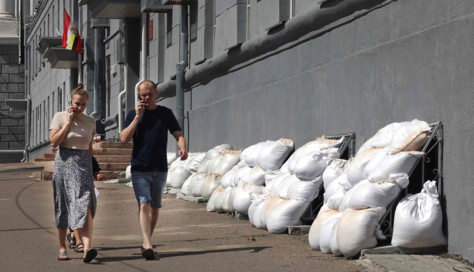 Moradores de Kursk falam ao telefone perto da Prefeitura da cidade — Foto: TATYANA MAKEYEVA / AFP