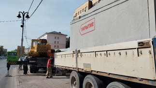 Trabalhadores municipais transportam abrigos de ônibus de concreto em Kursk em 22 de agosto de 2024 — Foto: Governor of Kursk Region/AFP