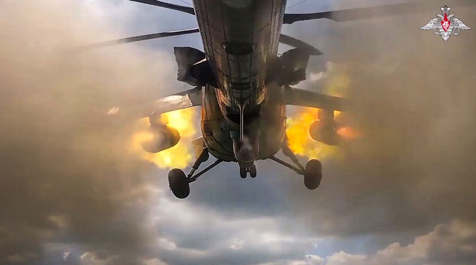 Helicóptero de ataque russo Mi-35m dispara foguetes contra forças ucranianas na área de fronteira da região de Kursk — Foto: Ministério da Defesa da Rússia / AFP