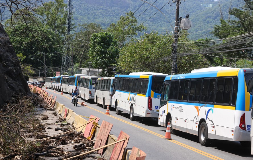 Com vias interditadas por ônibus sequestrados,outros coletivos ficaram impedidos de passar e formaram fila — Foto: Márcia Foletto / Agência O Globo