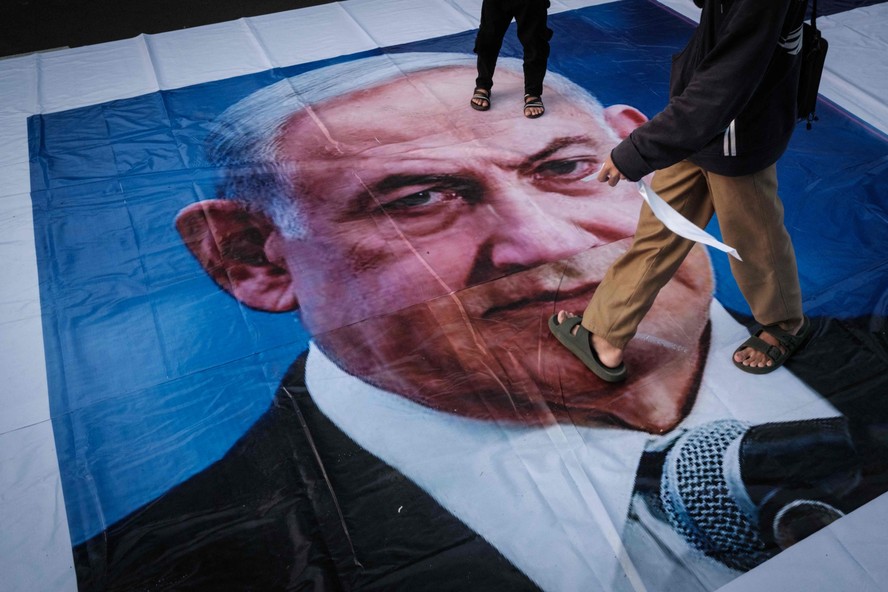 Manifestante caminha sobre cartaz com retrato de Benjamin Netanyahu durante manifestação pró-Palestina em Jacarta,Indonésia — Foto: Yasuyoshi CHIBA / AFP